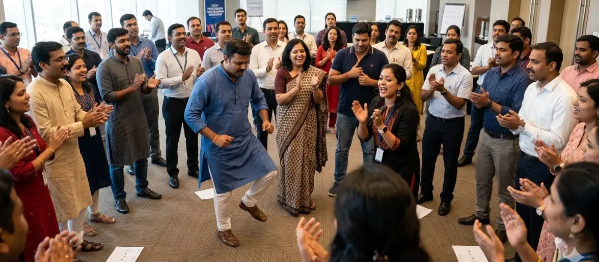 Body Percussion is a high-energy, immersive experience that transforms an entire organization into a synchronized rhythmic ensemble. This activity is a truly inclusive experience; it requires zero prior musical training, no physical instruments, and has no language dependency, making it universally accessible across diverse cultures, roles, and geographies. It ensures 100% participation—from introverts to senior leadership—creating a rare level playing field for engagement. Rooted in rhythm and movement, this activity is a science-backed tool for wellbeing, activating both hemispheres of the brain to enhance cognitive agility, concentration, and stress relief. It perfectly aligns with global workplace trends focused on mindfulness and experiential learning.