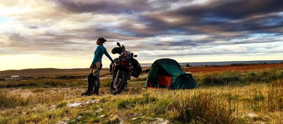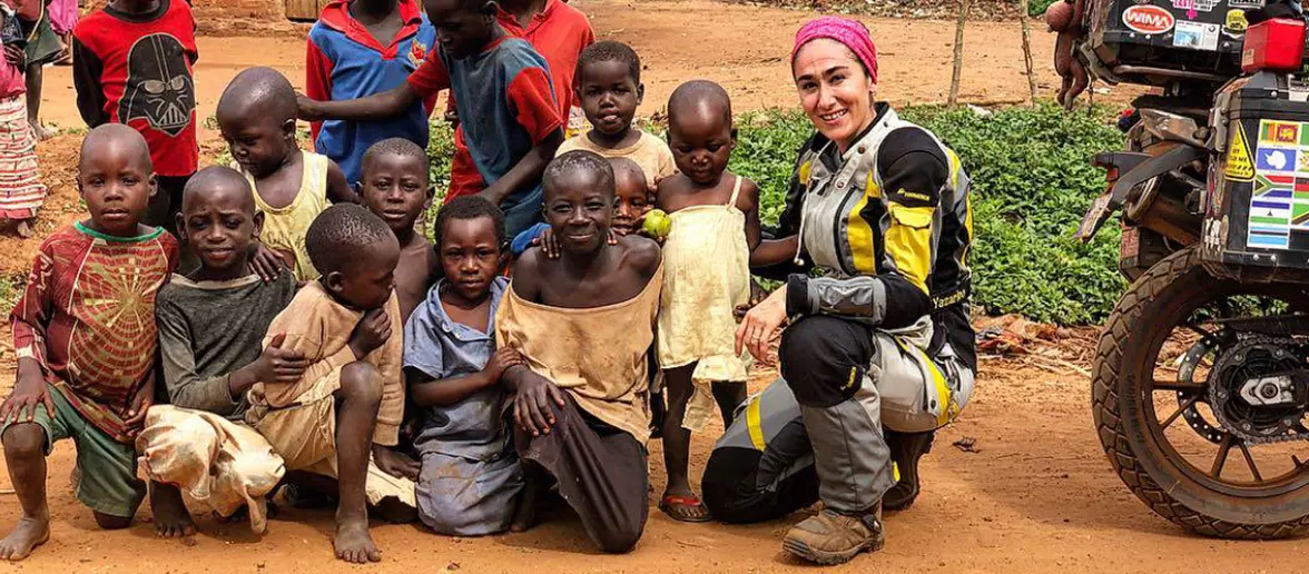 Traveled to all 7 continents and 64 countries on her bike, largely solo.